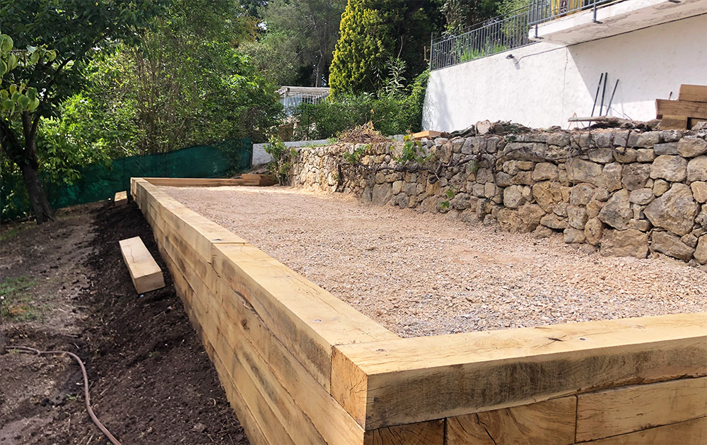 We will create your petanque court so you can experience the lively Provence game with friends and family or enhance an unused part of your garden. To do this, we level the ground, add crushed Biot sand, compact it, and add a wooden border.