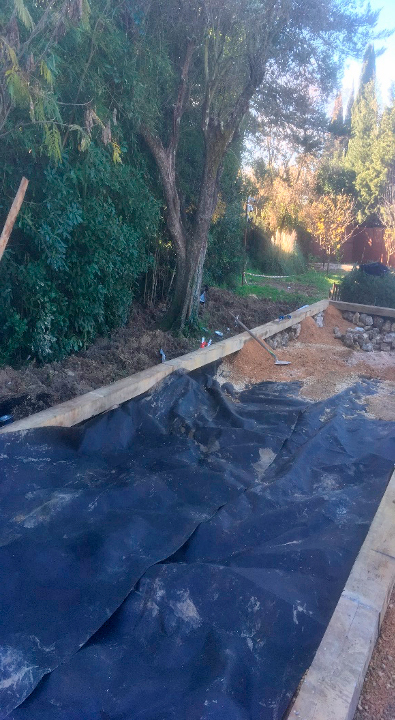 Nous nivelons le terrain, ajoutons du gravier concassé que nous compactons, ajoutons du sable de Biot que nous compactons aussi, le tout ceinturé par des traverses en bois de chemin de fer ou des poteaux en bois type électrique.