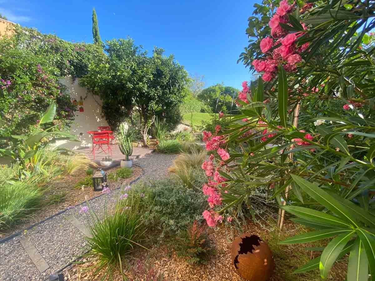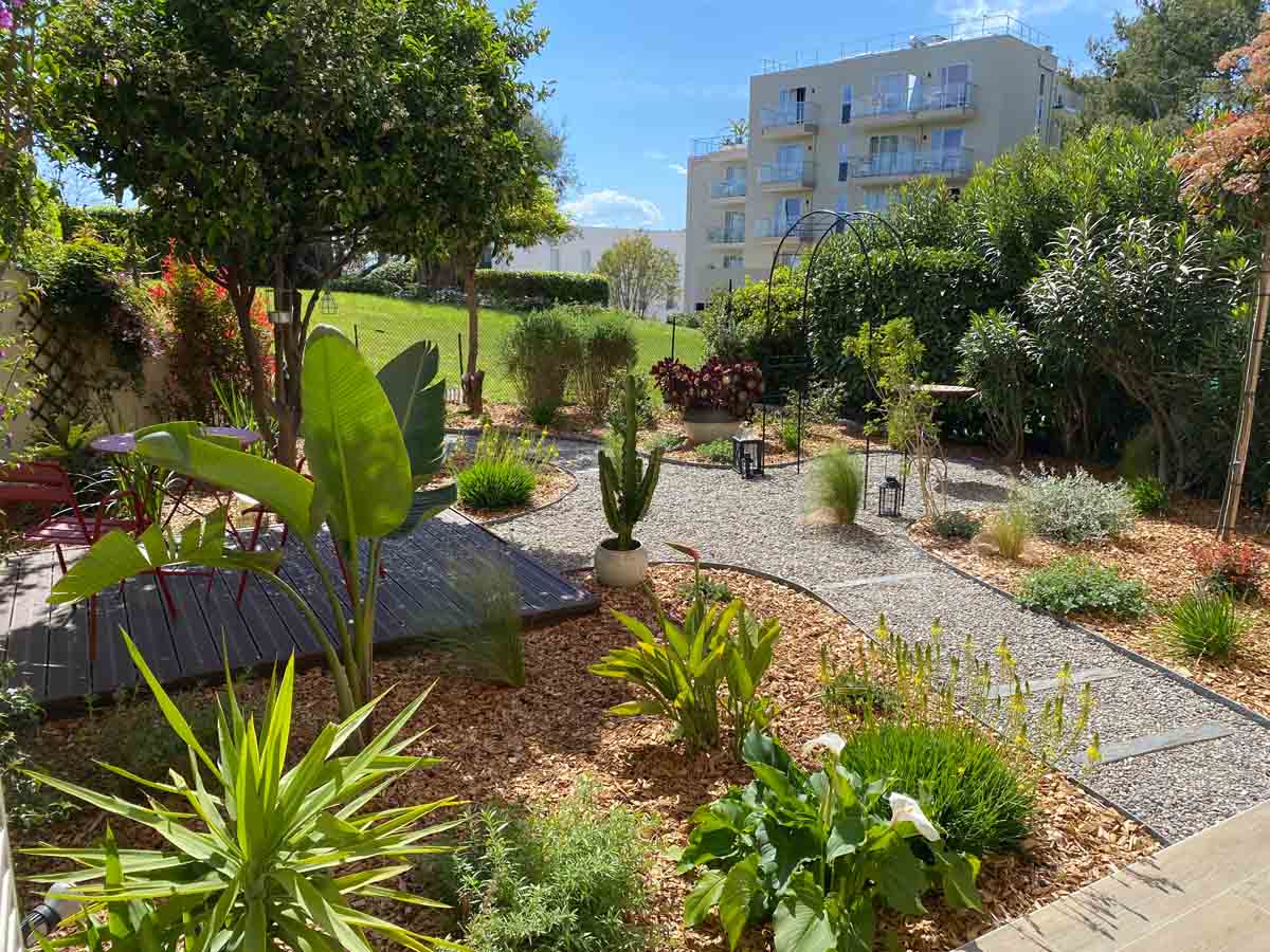 Pour limiter l'apport en eau et la maintenance, nous avons intégré les fondements du jardin méditerranéen : plantes arides choisies en fonction de l'ensoleillement, paillage et goutte-à-goutte.
