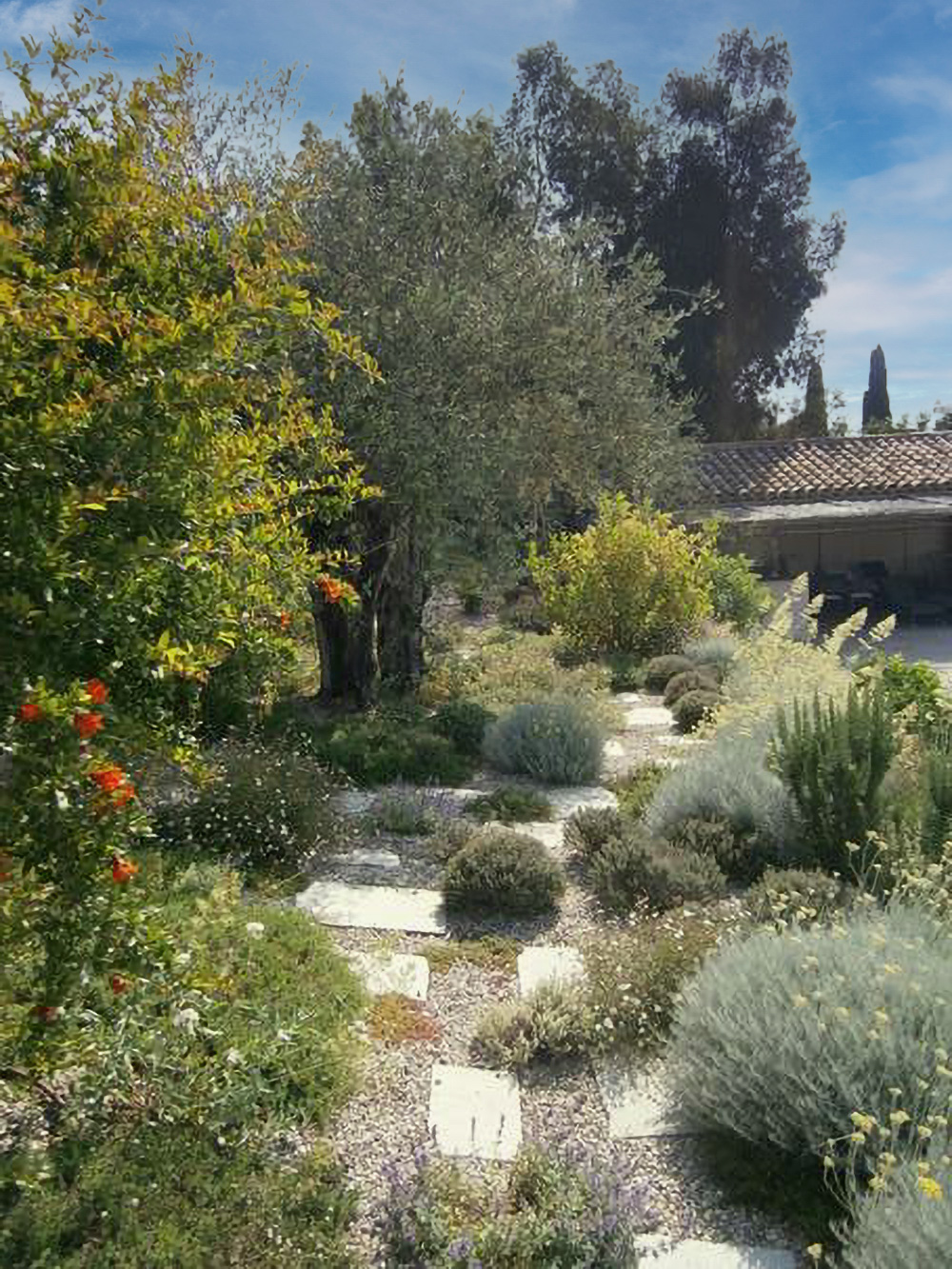 Un jardin sec marie des essences endémiques à la Méditerranée avec un paillage qui recouvre le sol. C'est une palette infinie de couleurs, de formes et de senteurs accueillant selon notre patrimoine agricole, le terroir et l’exposition le jasmin, les achillées, le mimosa, les myrtes, et beaucoup d’autres. Frugal par nature, il nécessite peu d'arrosage et d'entretien.