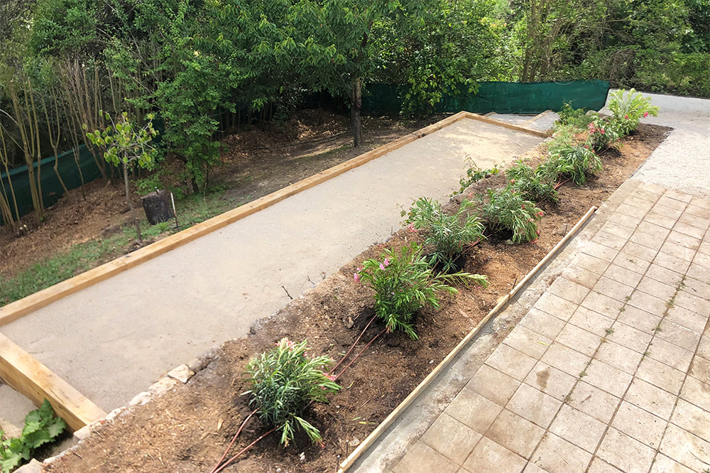 Notre client avait un espace en contrebas qui se prêtait idéalement à un jeu de boules : abrité du soleil par des arbres, il était long et étroit (3 mètres par 15), et pas exploité.