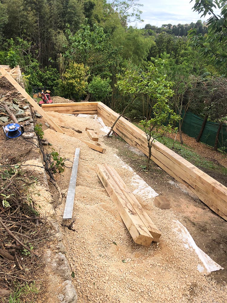 Comme le terrain est en pente, nous avons commencé par le redresser en empilant des traverses de chemin de fer et en comblant le fond avec du tout-venant. Les traverses ont également servi pour construire d’élégantes marches menant au terrain.
