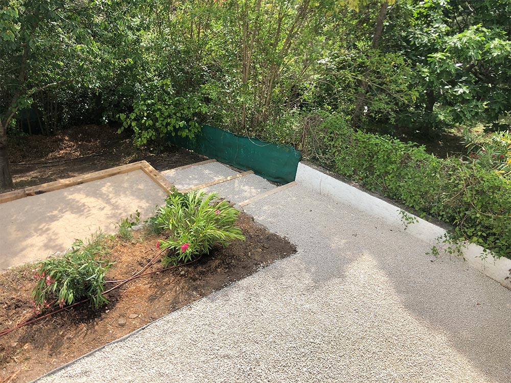 Avec la création du terrain de pétanque, notre client exploite son jardin dans son intégralité, et ajoute une note de contraste avec les arbres et la pelouse environnants.