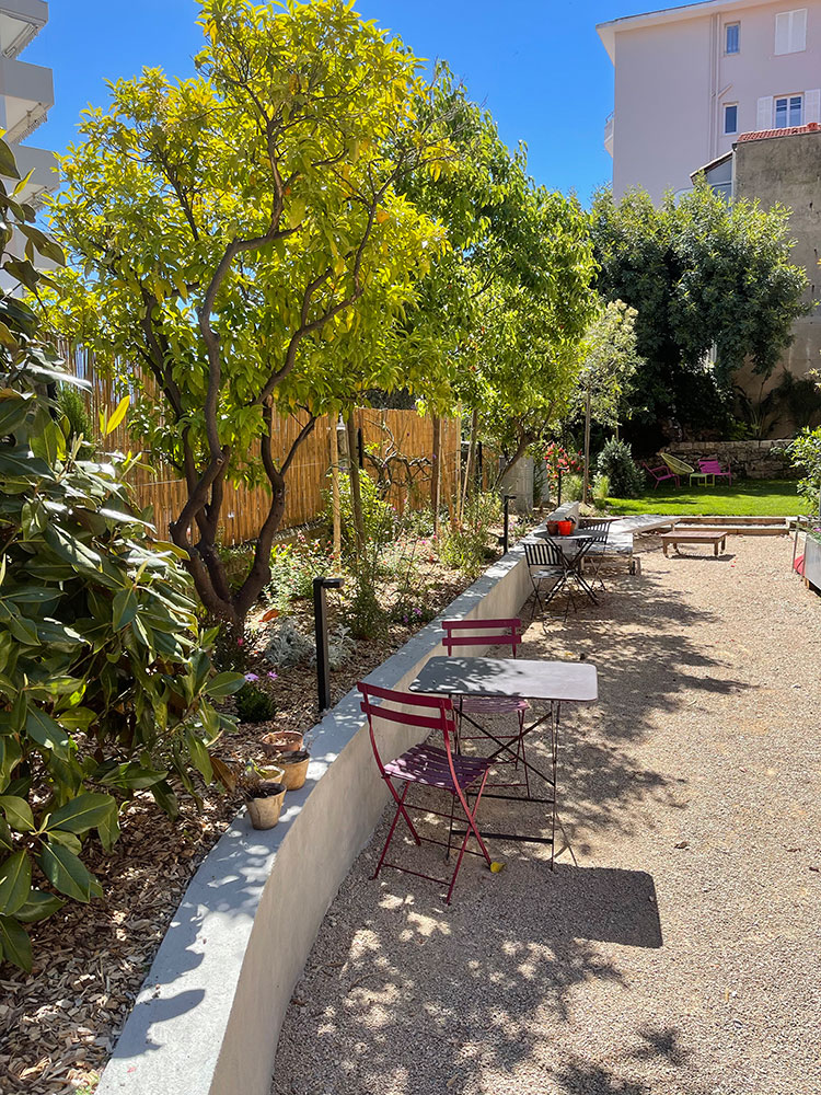 Au fond, une pelouse généreuse, posée en rouleaux, invite à la sieste. On y accède par des marches en traverse et comblées par des galets de Malemort.