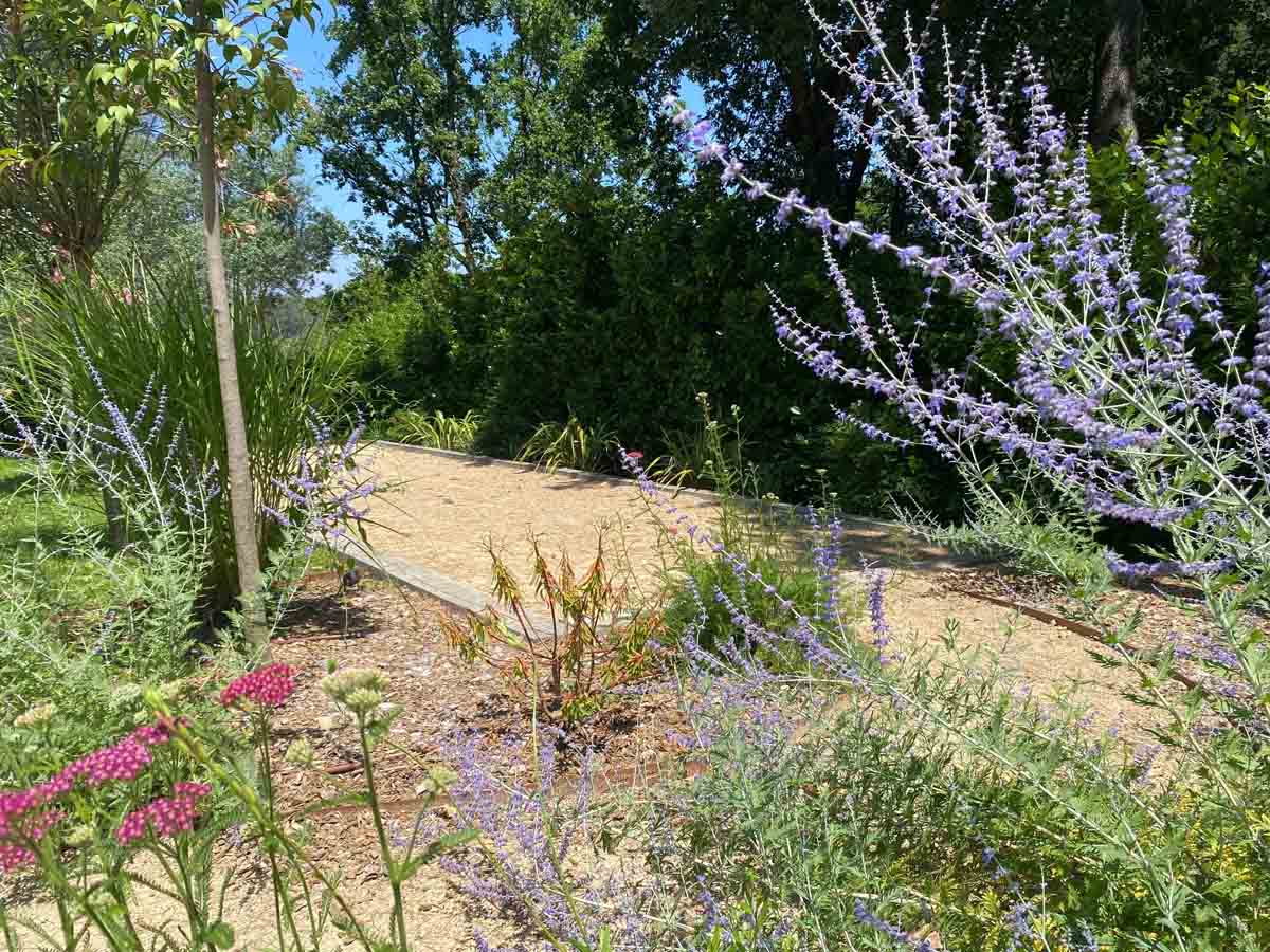 Le bas du jardin au nord, plus frais, offrait les conditions idéales pour implanter un terrain de boules. Nous l’avons agrémenté d’une terrasse en béton brut pour l’apéro et les mi-temps. On y accède par un chemin tapissé de sable stabilisé qui ondule entre les plants de jardin sec. Tout en rondeur, ils contrastent avec les angles de la maison et de la terrasse. Une trentaine d’espèces différentes y poussent, avec une dominante pastel mêlant le violet et l’orange. Des bacs en acier corten contenant des westringias ponctuent la promenade. L’ensemble entraine le visiteur dans une joyeuse danse de matières et de couleurs.