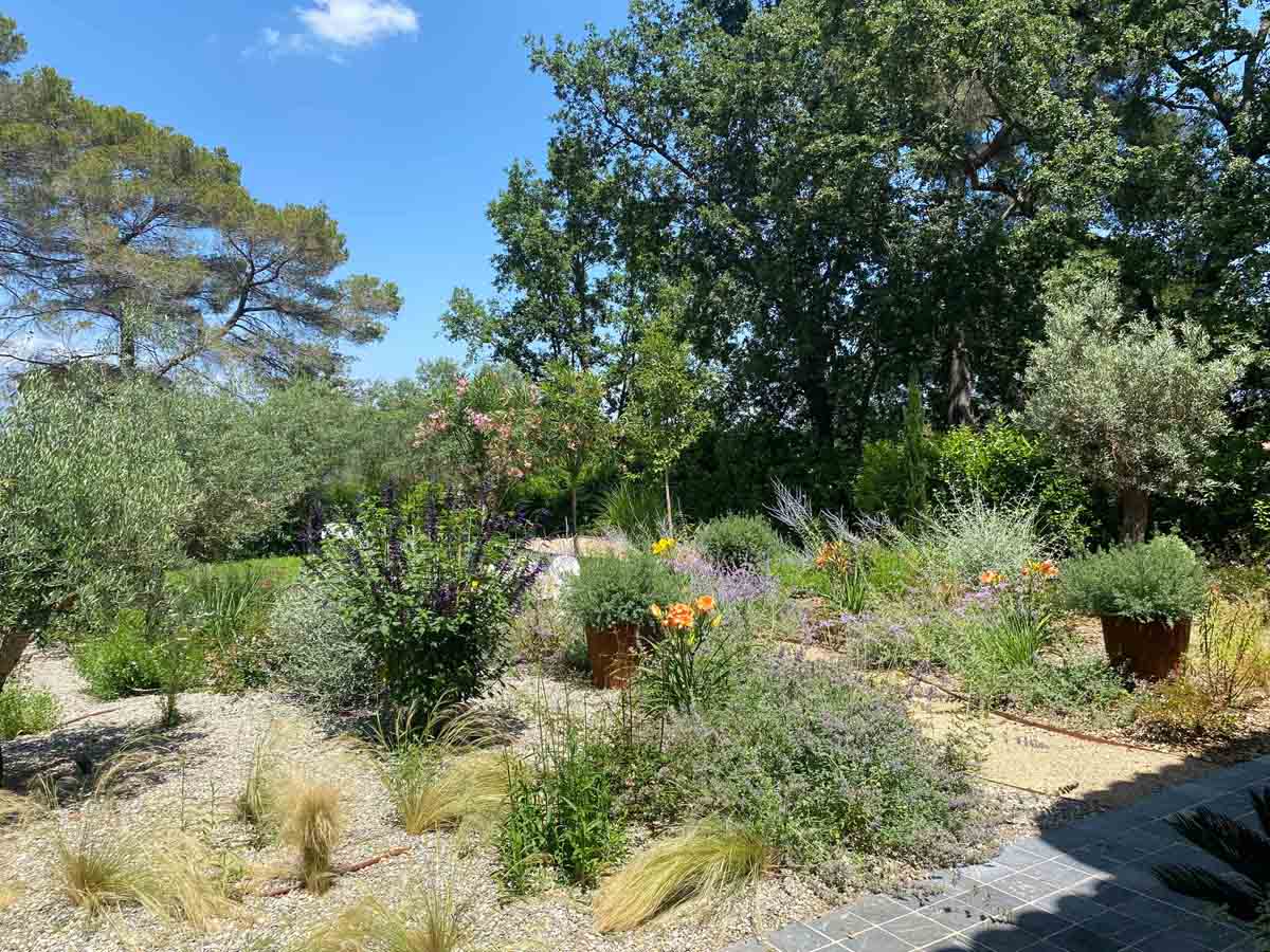 Pour la partie haute du jardin incluant la piscine, nous avons aménagé un jardin sec avec des plants aux couleurs chaudes. Les piliers du poolhouse sont habillés avec du jasmin de Grasse diffusant son parfum envoutant au cœur de l’été et de l’automne.