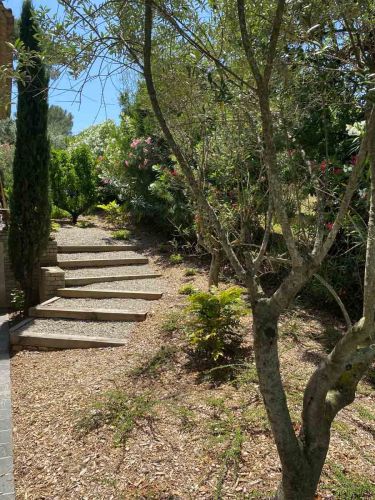 Côté ouest de la villa, nous avons créé un cheminement tout en douceur avec des marches en traverses de chemin de fer et galets de Malmort, flanqués de mulch végétal sur les bas-côtés.